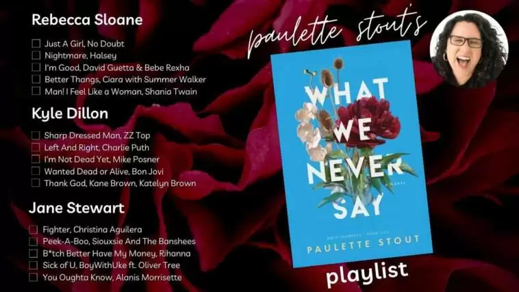In true “me” fashion, I’m not choosing again! Rebecca, Kyle, and Jane—my main characters in What We Never Say—are each cut from different cloth. The songs I’ve chosen represent their unique passions, fears and obsessions, as well as their relationships with each other. -Paulette Stout